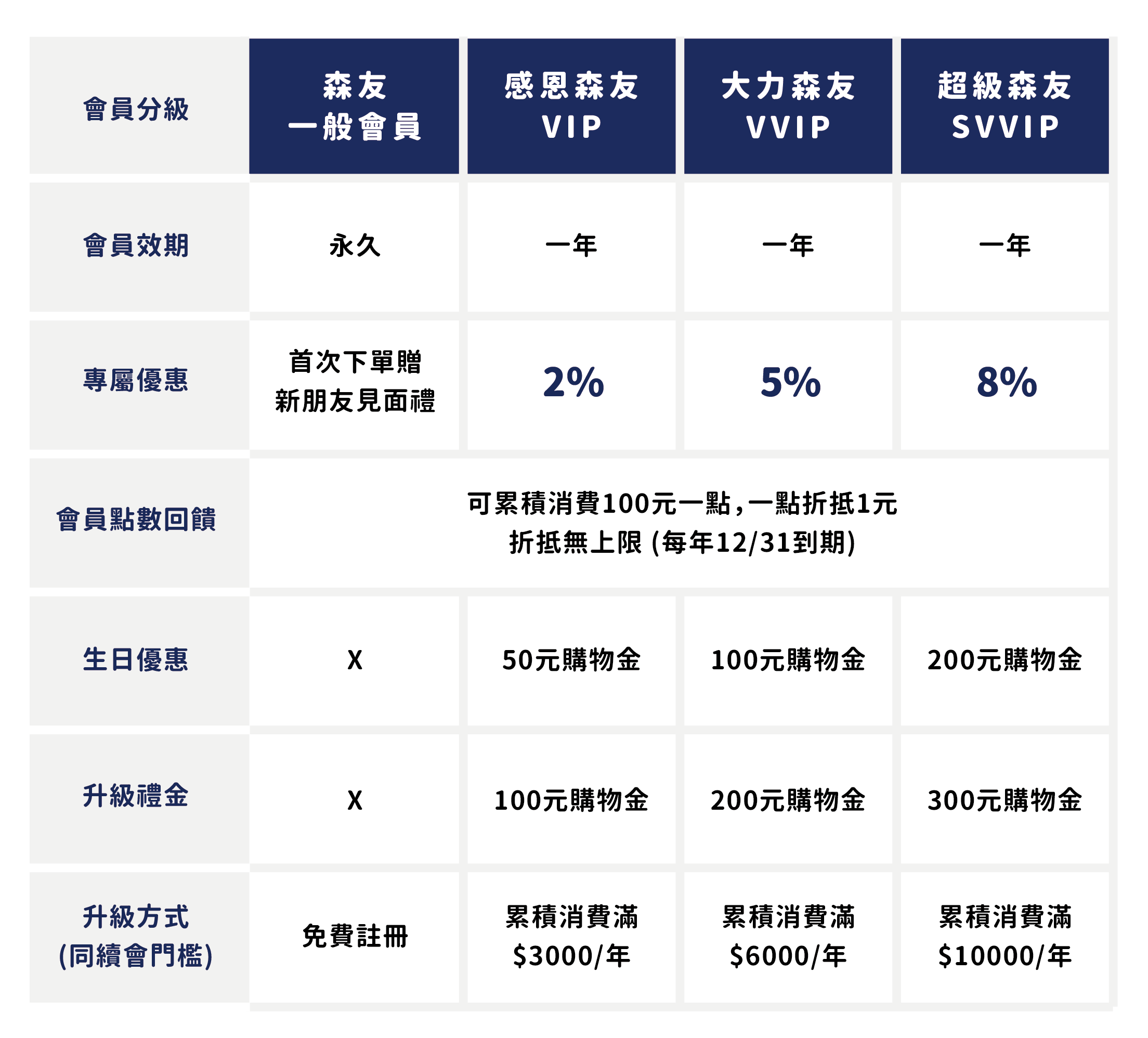 •感恩森友(VIP):當年度累積消費滿 $3,000元(一年,會藉內累積消費滿$3,000元可續會)