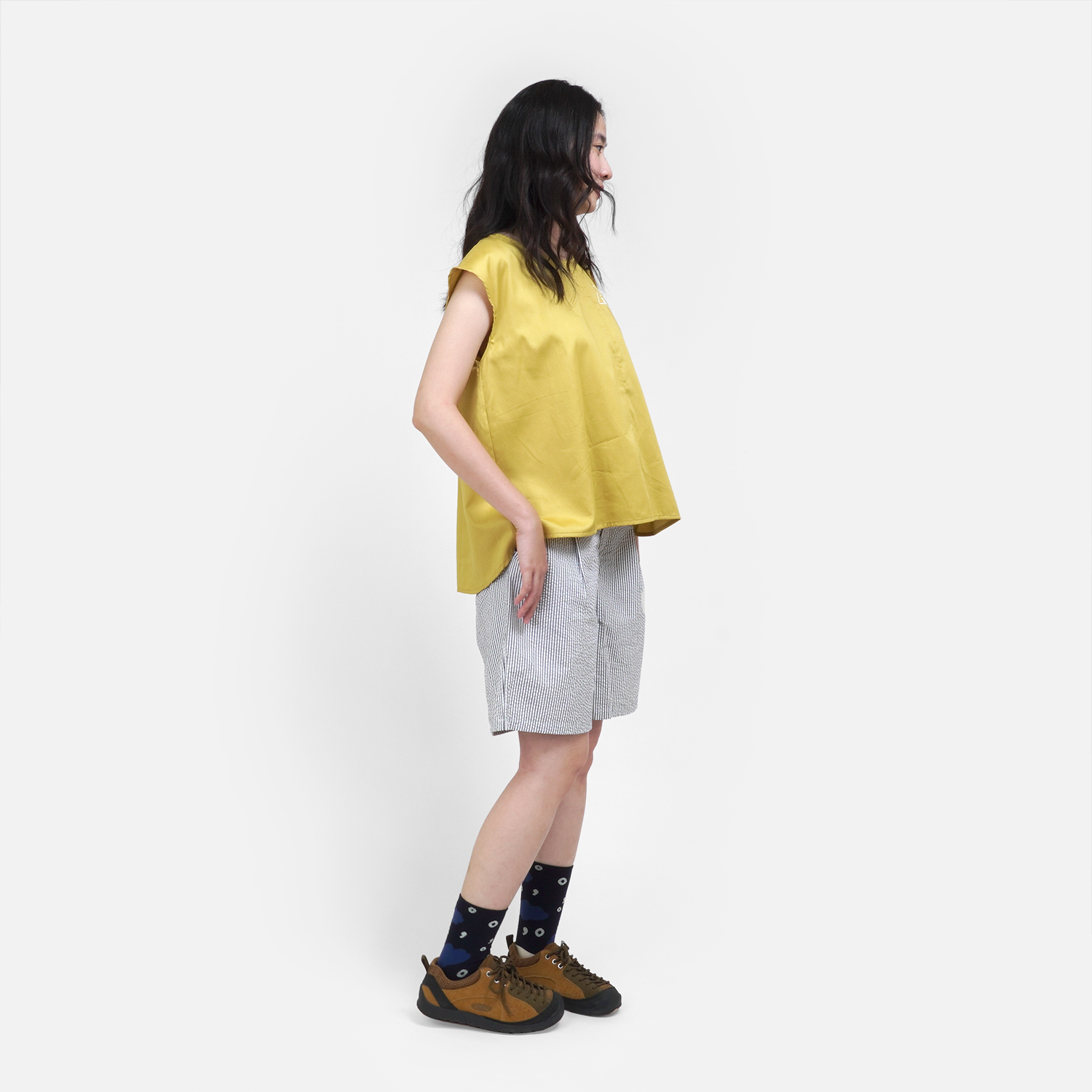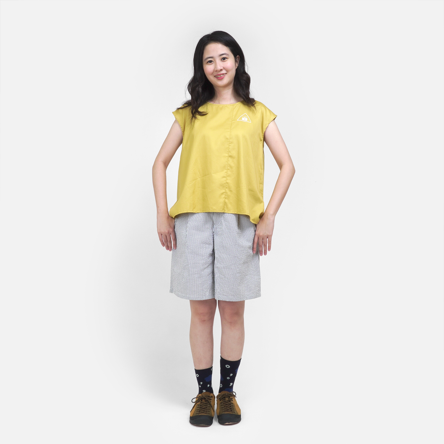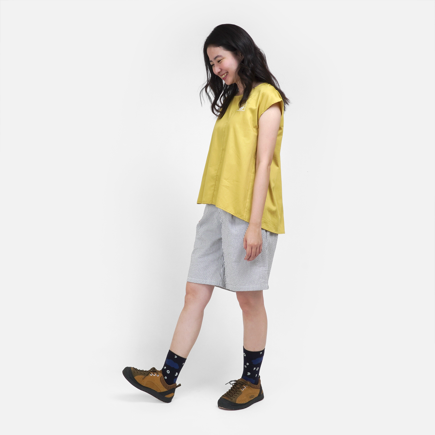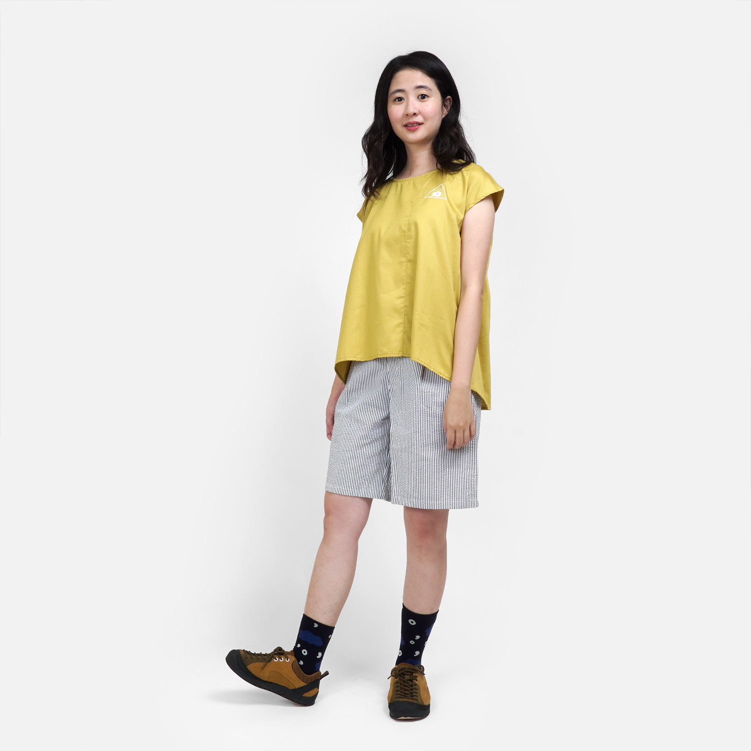 清爽的檸檬黃色,搭配 [ 窗外星空條紋打褶短褲 ]