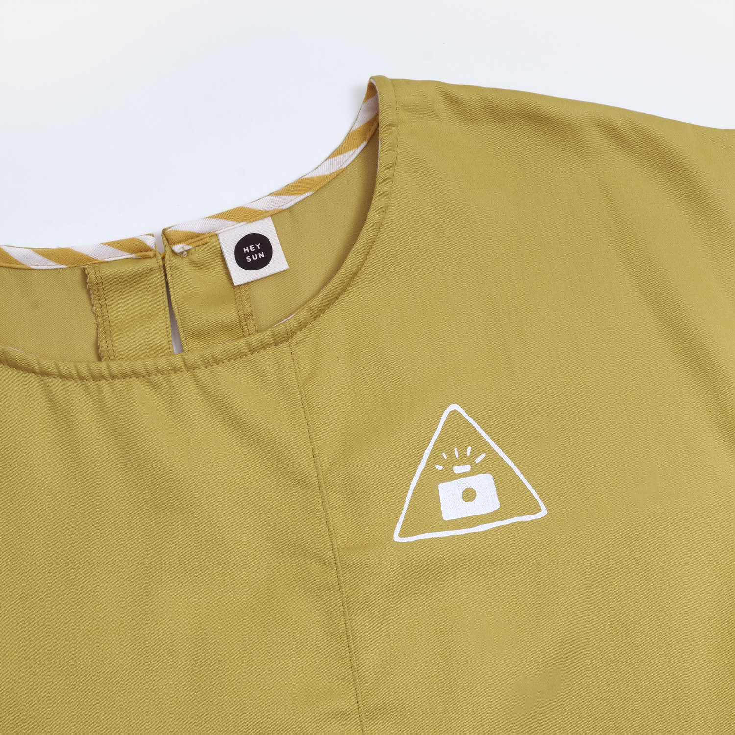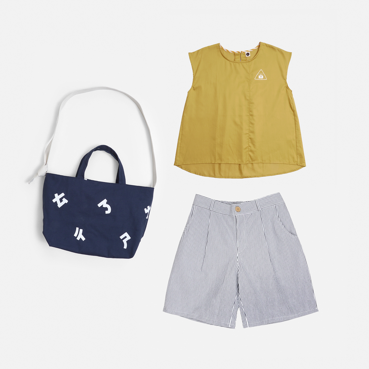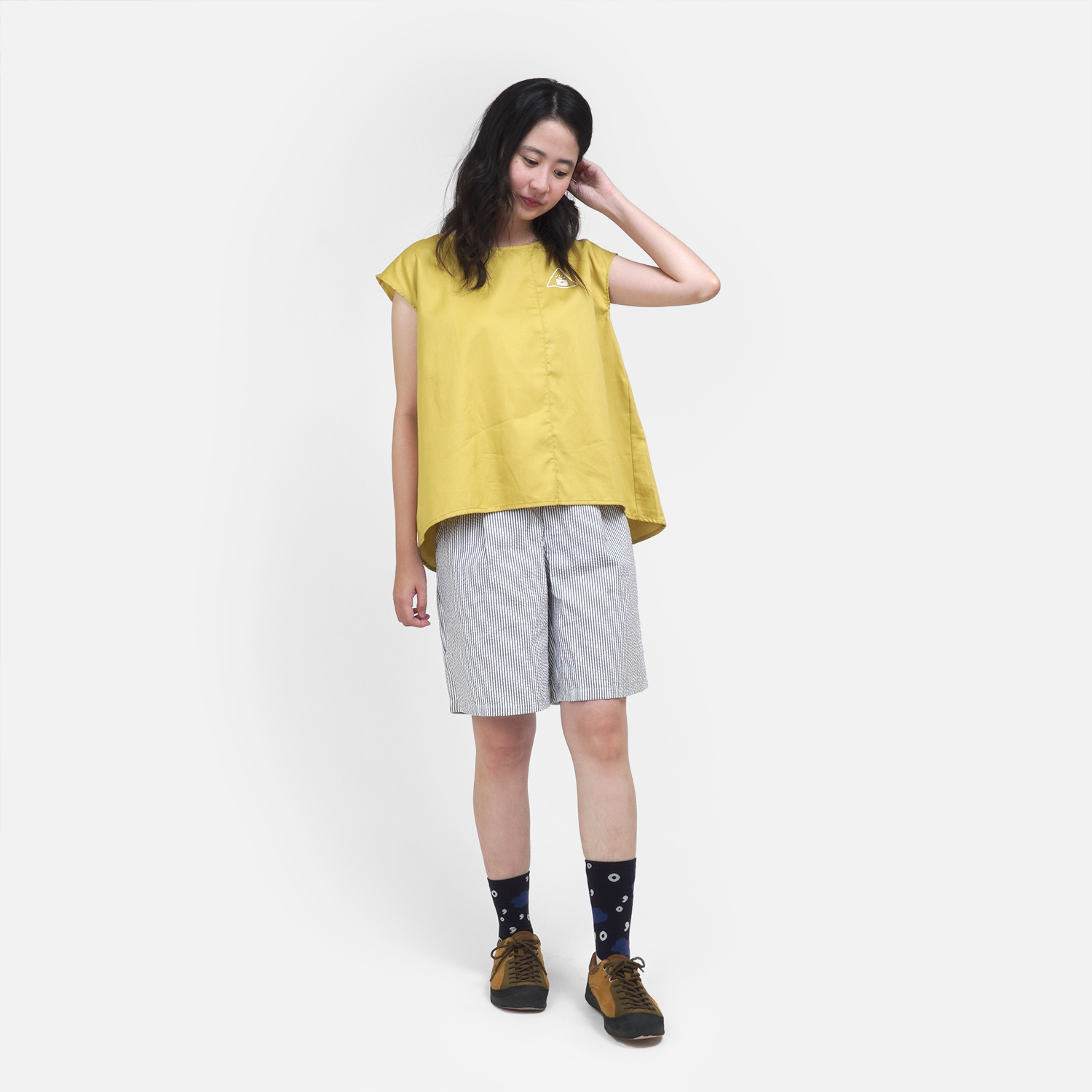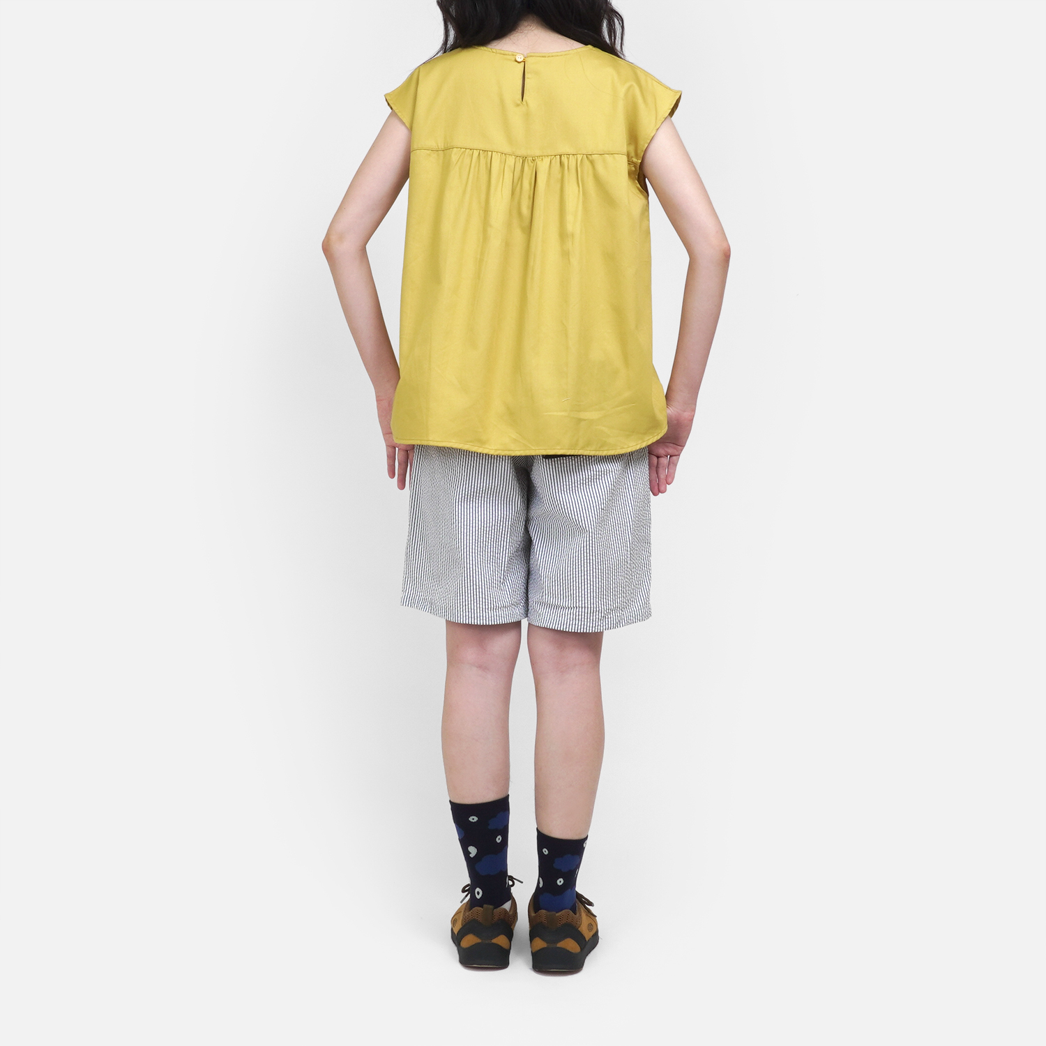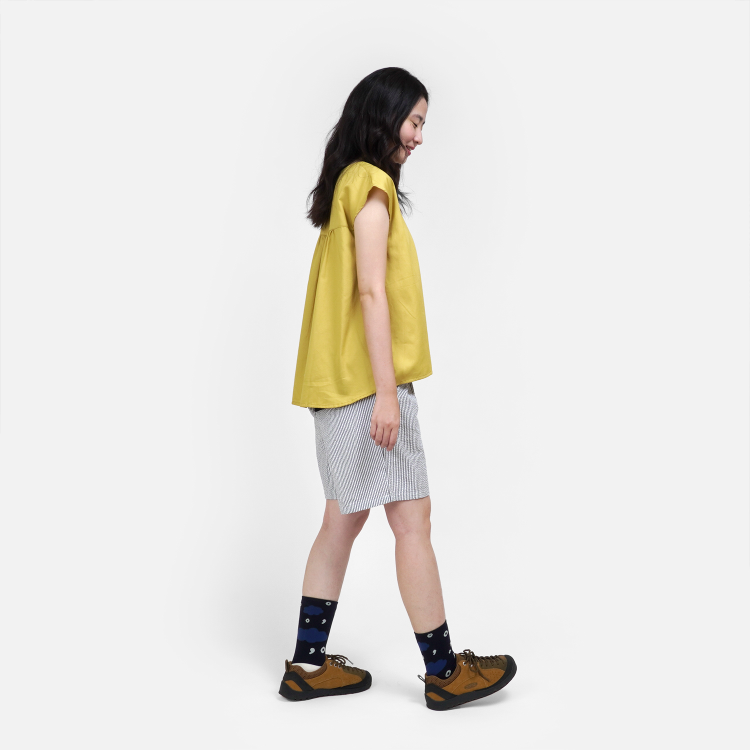 清爽的檸檬黃色,搭配 [ 窗外星空條紋打褶短褲 ]
